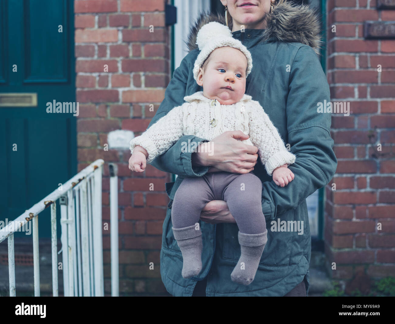 A Young Mother And Baby In Winter Clothes Outside The House Stock Photo Alamy
