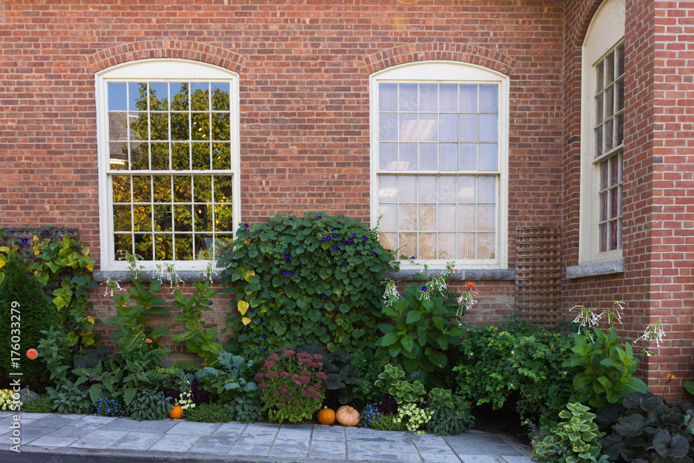A Small Garden With Bushes Flowers And Pumpkins Next To A Brick Building With Shiny Windows Photographed In Natural Light Stock Photo Adobe Stock